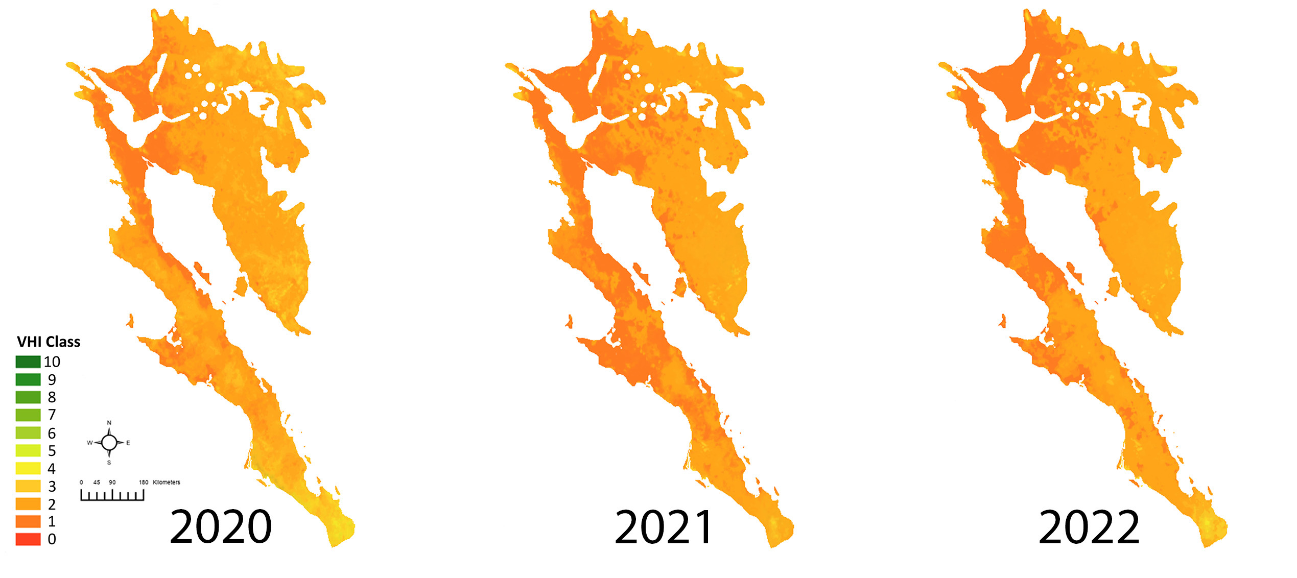 - A landscape level assessment of ecosystem stress across the entirety of the Sonoran Desert based on precipitation and temperature data from meteorological stations and a satellite-derived vegetation health index (VHI),